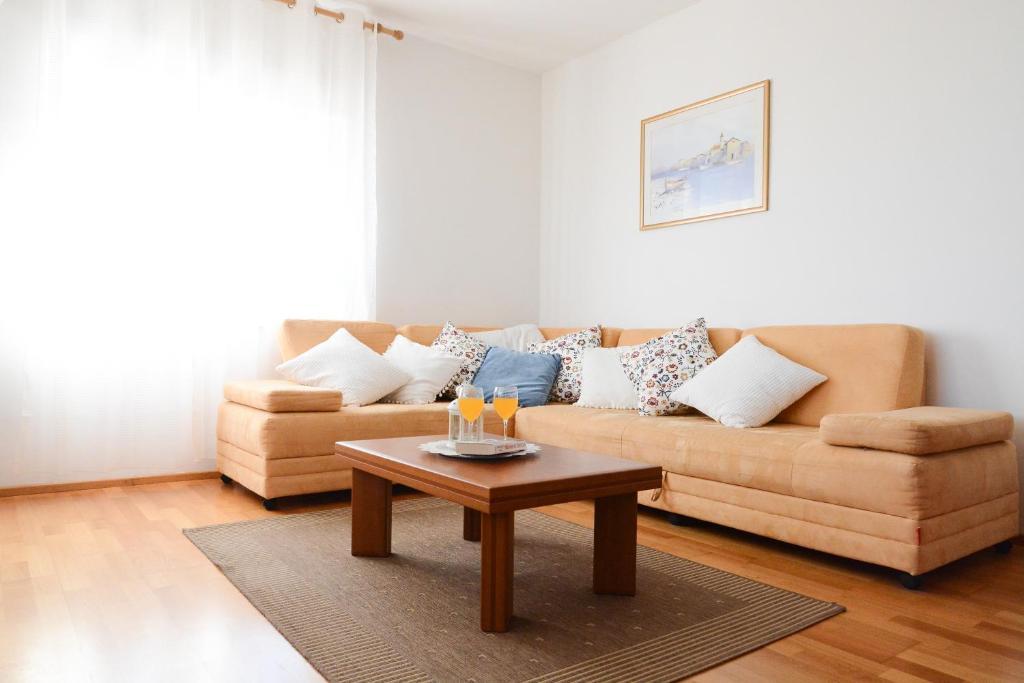 Apartment can accommodate 4 guests. Beds are situated in 1 sleeping rooms, but also in the living room, within 56m2. Guests can use a private terrace to enjoy the warm summer evenings. Food can be prepared using barbecue which is shared with other guests too. Shared pool is on disposal during stay. This accommodation unit welcomes pets at an additional charge.