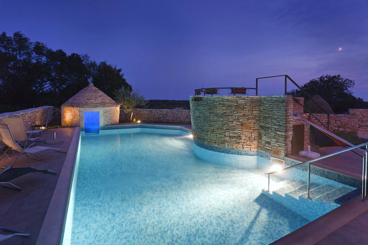 Casa può accogliere 12 ospiti. I letti sono disposti nelle camere da letto che sono 5, su 162m2. Gli ospiti hanno a disposizione il proprio terrazzo per godere nelle calde serate estive. Dalla casa si gode di una vista sul mare. Durante il soggiorno gli ospiti si possono rilassare nella piscina privata. Arrivati nell'unità d'alloggio i clienti devono pagare un deposito (il prezzo è indicato sul sito).