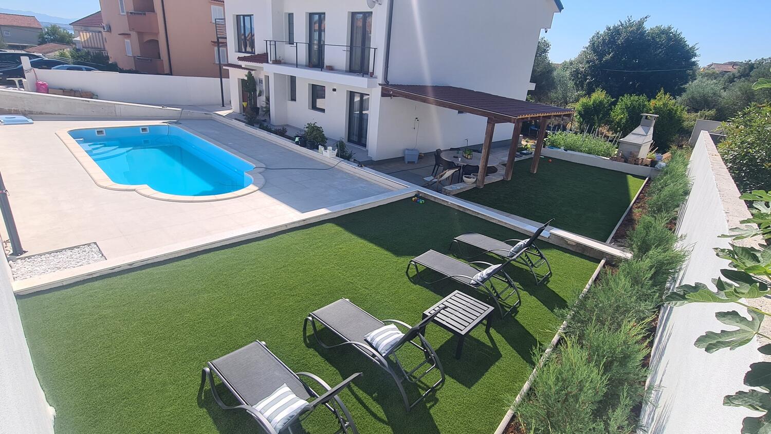 Appartement biedt plaats aan 7 gasten. De lagers zijn gerangschikt in slaapkamers met 3, binnen 85m2. Gasten hebben een eigen terras waar ze kunnen genieten van warme zomeravonden. Het is toegestaan om voedsel te bereiden met behulp van een gemeenschappelijke grill. Tijdens hun verblijf kunnen gasten gebruikmaken van het gedeelde zwembad.